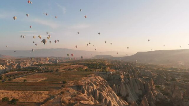 Aerial view Colorful hot air balloons rise over unique Cappadocia arid landscape at sunrise, symbolizing freedom, adventure, bucket list travel, get away, romantic escape, natural wonders