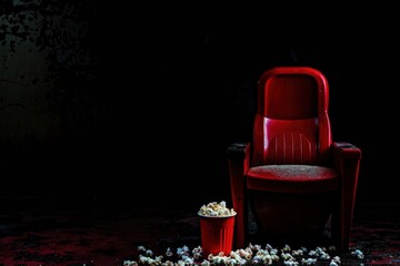 Red cinema armchair and bucket with popcorn, leisure and cinema concept, black background.