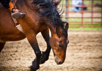 Wild horse bucking and rearing after throwing off the cowboy during bronco riding town rodeo