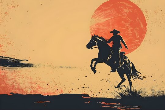 Illustration of a cowboy riding a bucking bronco. Concept Western Theme, Rodeo Action, Wild Ride, Cowboy Adventure, Horseback Challenge