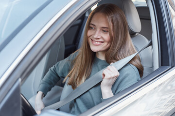 Delighted young woman belting up before auto trip