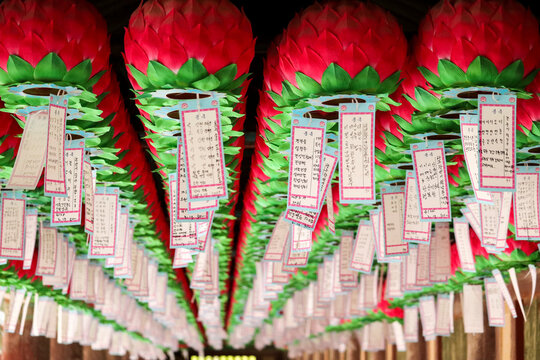 Laterne mit wunschzetteln an einer Decke eines buddhistischen Tempels in Korea, Gyeongju, Bulguksa