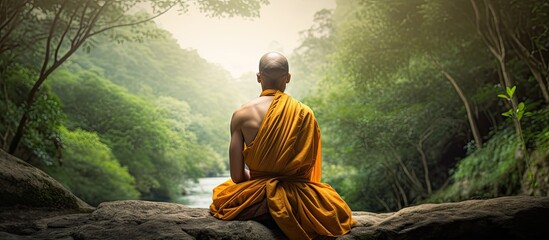 Buddhist monk meditating while sitting on a rock created with generative AI technology