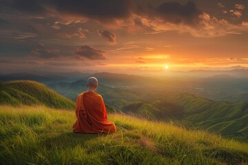 Buddhist monk in meditation at beautiful sunset or sunrise background on high mountain