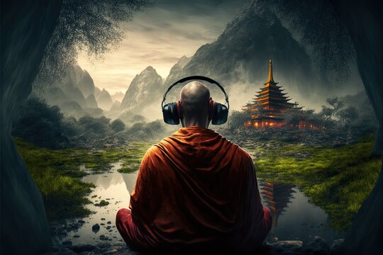 Rear view of buddhist monk in lotus position listenin, created with Generative AI technology