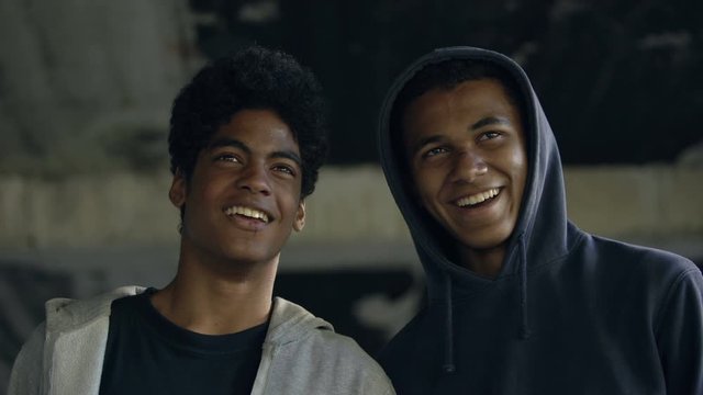 Two afro-american friends in hoodie laughing together, black teenage buddies