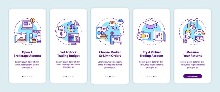 Stock trading steps onboarding mobile app page screen with concepts. Open account, setting budget walkthrough 5 steps graphic instructions. UI, UX, GUI vector template with linear color illustrations