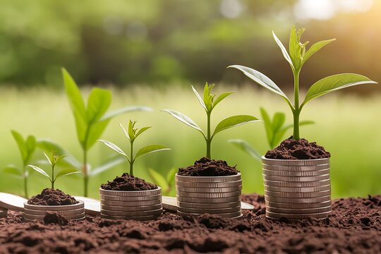 Coin investment growth plant sustainable wealth financial forecast prosperity Capital expansion adviser income balance asset security profitable business trajectory blur background stack money saving