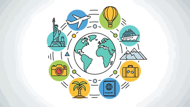 Global Travel and Tourism Concept with Famous Landmarks and Transportation Icons