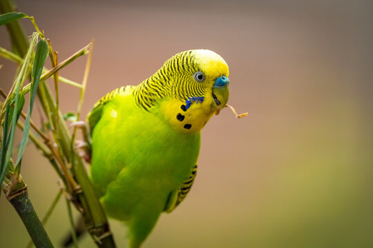 A beautiful blue budgie sits without a cage on a house plant. Tropical birds at home.