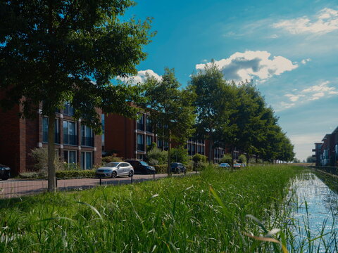 Modern apartments alongside naturalized wetland with water lilies and reeds providing ecological buffer