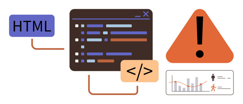 HTML tag, coding interface with bug highlights, triangle warning, and analytics chart. Ideal for coding, debugging, programming, error management, data analysis software flat design metaphor