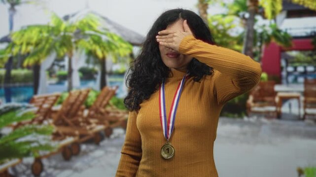 Woman brunette wearing gold medal and mustard sweater covering eyes in hotel building poolside; modest pride.