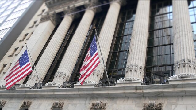 New York City, United States. Lower Manhattan Downtown Financial District urban architecture exterior. American flag. Wall street Stock Exchange building facade columns, USA Stock Market trading, NYC.