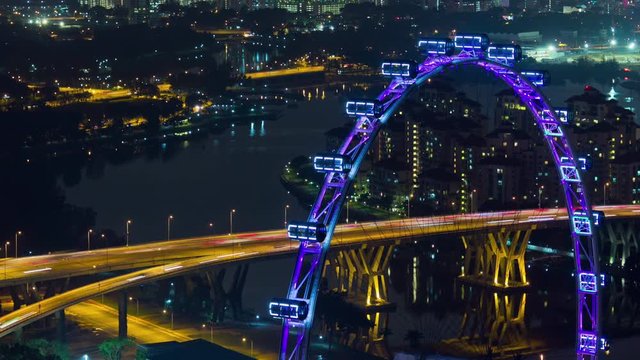 night illuminated singapore famous flyer traffic bridge road top panorama 4k timelapse