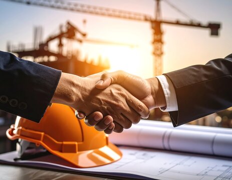 A handshake seals a deal between two professionals over construction blueprints, a hard hat nearby, with a construction site in the background