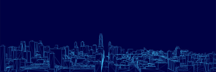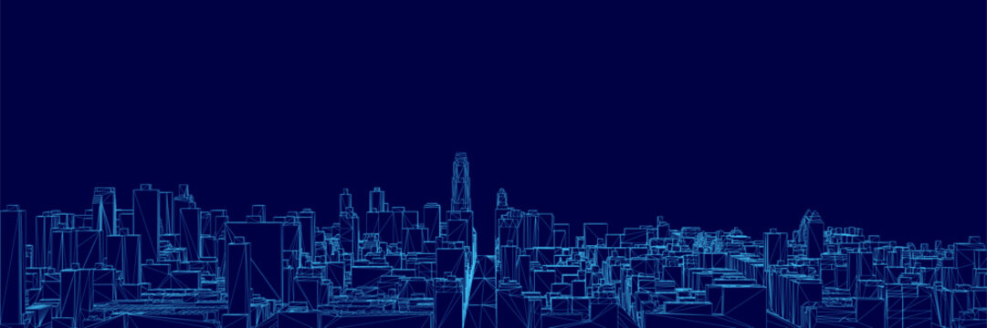 A wireframe city blueprint on a dark blue background features white building outlines in stark contrast. This conceptual design represents urban planning and futuristic architecture.
