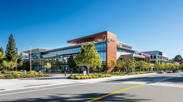 A modern medical building with a glass and wood facade, set against a clear blue sky. The building is located in Mountain View, California, and features a landscaped courtyard with trees and shrubs. T