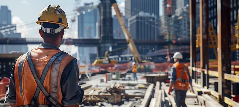 Illustration digital building construction engineering with double exposure graphic design. Building engineers, architect people, or construction workers working. Generative AI