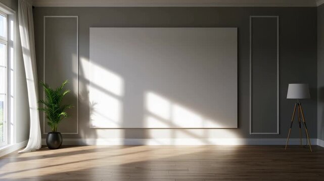 Sunlight moving across an empty room with a large blank canvas, plant, and lamp, showing architectural interior design footage.