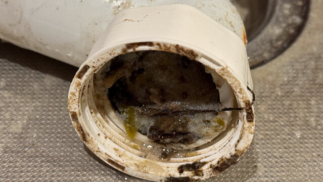 Clogged dirty sink pipe with food residue and grease buildup inside white plastic plumbing trap for maintenance, repair or hygiene issues in kitchen settings
