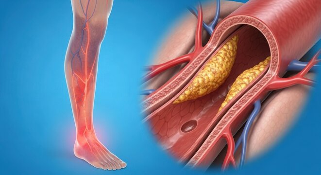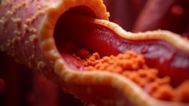 Macro Animation Inside Clogged Human Artery with Plaque Buildup. Red Blood Cell Flow and Cholesterol Blockage Representing High Blood Pressure and Atherosclerosis.