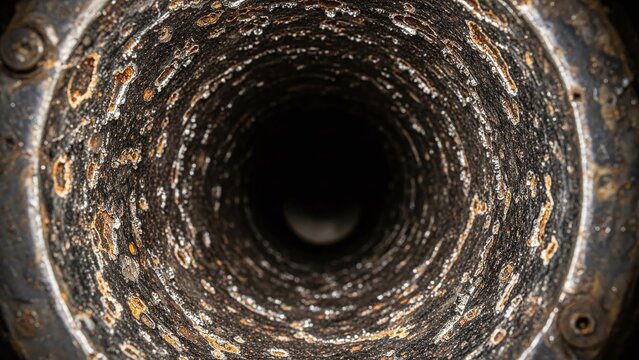 Internal view of a heavily corroded industrial pipe with significant scale buildup and oxidized surface deposits