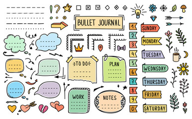 Bullet journal doodle diary color elements, stickers and paper notes, vector notebook frame. Bullet journal planner week day and numbers stickers, to do list or calendar plan labels and banners