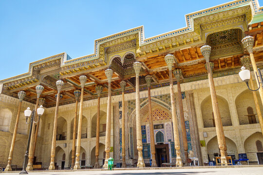 Street colonnade of the Bolo-Haouz mosque: painted wooden ceilings and carved columns. Shot in Bukhara, Uzbekistan