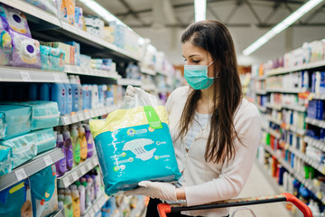 Woman shopper with mask and gloves panic buying disposable diapers.Preparing for pathogen virus pandemic quarantine.Prepper buying bulk baby products supplies due to Covid-19.Diapering deficiency