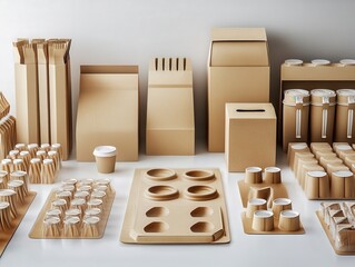 Assorted eco-friendly packaging items displayed on a white surface. Ideal for food service and environmental sustainability themes.