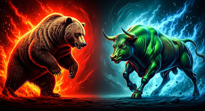 Dynamic bull and bear market symbols clash, representing financial trading and economic volatility