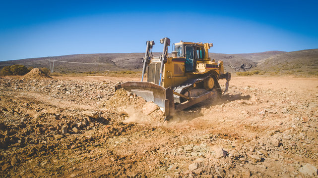 Crawler bulldozer working on construction site or quarry. Mining machinery moving clay, smoothing gravel surface for new road. Earthmoving, excavations, digging on soils.