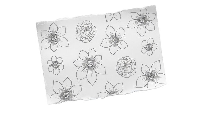 White torn paper features hand-drawn black outline floral illustrations, including roses and simple flowers, offering a delicate, decorative design element. background removed