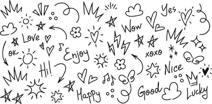 Mega hand-drawn doodle element set featuring sketchy speech bubbles stars crowns hearts and lightning bolts for creative social media storytelling journaling and whimsical branding design