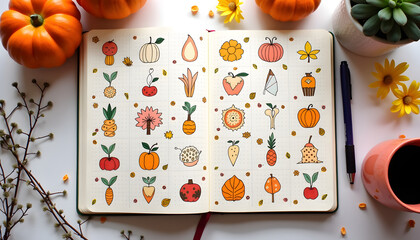 A colorful bullet journal spread featuring hand-drawn autumn doodles and fruit illustrations.