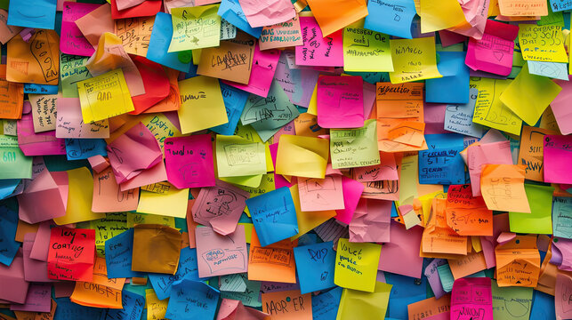 Multi colored adhesive notes on chaotic bulletin board inspire modern creativity