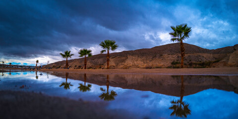Colorado River Landscape Series at Bullhead Community Park with dramatic cloudscape, palm trees, sandbar, water reflections, birds, and rain, in Bullhead City, Arizona, USA