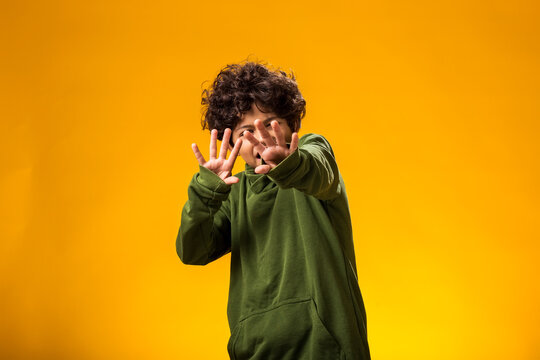 Afraid child boy showing stop gesture on yellow background. Bulling and negative emotions concept