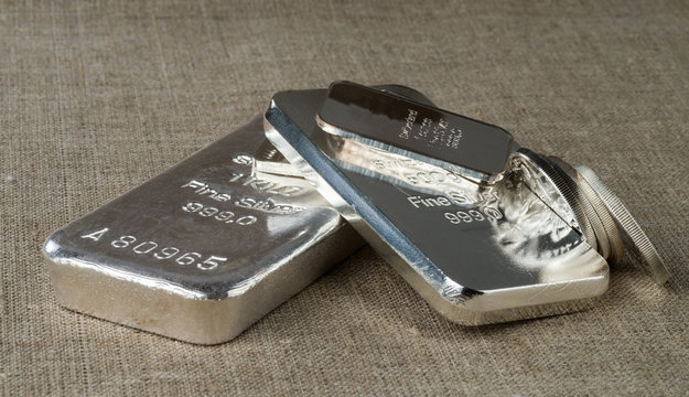 Silver bullion (bars and coins) on a background of a rough wooden texture. .