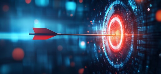 A digital arrow targeting a glowing red bullseye in a tech landscape.