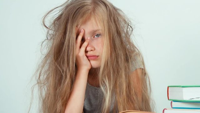 Portrait tired sad girl 7-8 years old does not want to study and reading books. Zooming