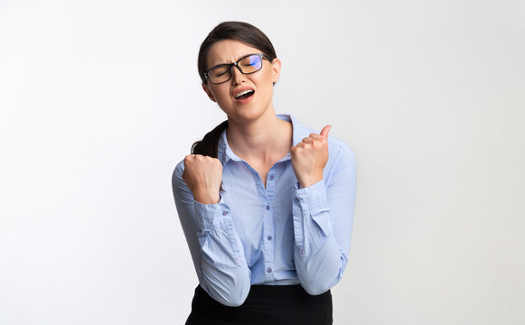 Sad Businesswoman Shaking Fists In Disappointment Standing In Studio