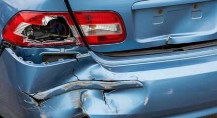 Damaged rear bumper of a light blue sedan showing significant collision impact.