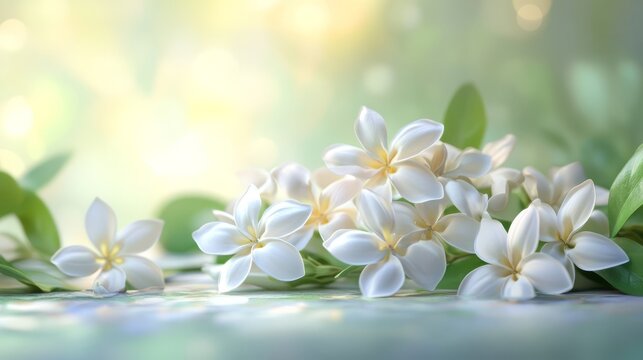 54.A beautiful, hyper-realistic bunch of Indian jasmine flowers lying on the ground, surrounded by light green foliage, with the soft, muted green background adding to the peaceful ambiance.