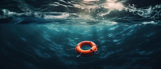 Lifebuoy floats in rough sea waters. Safety and rescue concept. Generative AI