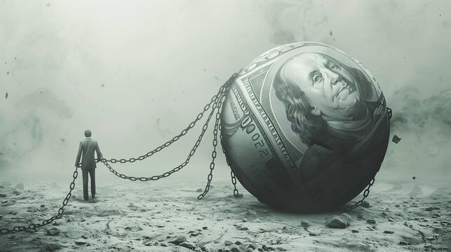 The burden of debt. A man stands next to a large ball with a chain, symbolizing the weight of debt and financial struggles in modern society