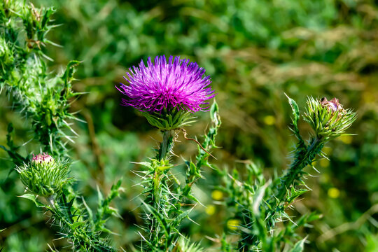 Purple flower of carduus with green bud isolated on a white background. Design element for product label, catalog print, web use.