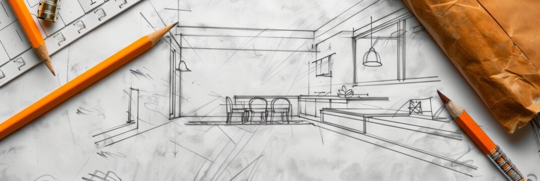 A detailed drawing of a kitchen filled with pencils and paper, showcasing a renovation project in the works with intricate design plans being developed. Generative AI