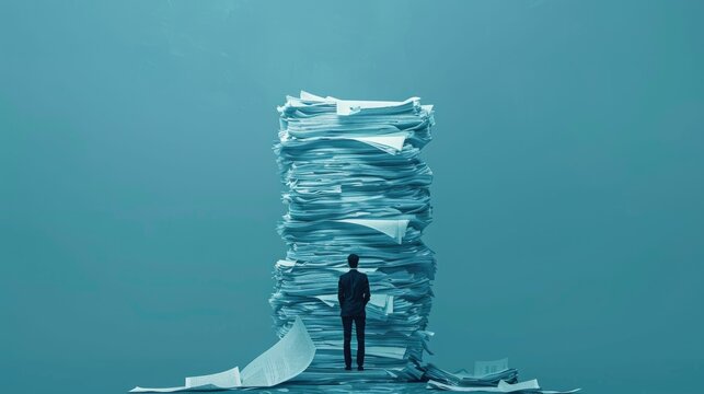 Man stands in front of an enormous stack of papers, symbolizing overwhelming workload, paperwork, and stress in blue background.